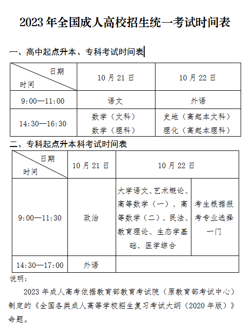 1、准考证打印 今年成人高考的准考证打印时间为2023年10月18日-21日,打印时间为10月18日至20日每天8:30至17:00,10月21日至22日每天7:00至17:00。学生可以登录山东省教育招生考试院官网成人高考网上报名平台自行下载打印,或联系报考的机构老师代为打印。 2、考试用具 学生考试时需要携带本人身份证原件、准考证、考试作答文具(2B铅笔、橡皮、0.5mm黑色签字笔,尺子)等相关用具参加考试,严谨携带手机、手表等电子设备进入考场,所以大家可以把自己的东西放到车里或者专门的存放点。 3、考试时间安排