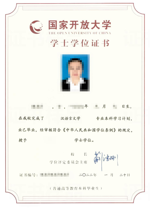 三、报名资料 1、报名表 2、高清蓝底电子版照片 3、身份证原件及复印件 4、毕业证书复印件(专升本学生需提供专科学历的学信网截图或电子注册备案表)无法查询的需提供《中国高等教育学历认证报告》 四、报考优势 1、免试入学 国家开放大学实行注册入学制度,只要符合报名条件,就可以直接免试入学,无需参加全国统一的成人入学考试。 2、学习方式灵活 国家开放大学依托网络学习平台,学生可通过线上平台进行学习。所以学生可以根据自己的时间和地点的灵活性进行学习,非常适合工作繁忙且没有时间学习的在职人群报读。 3、一年两次入学机会 国家开放大学实行3月份和9月份(春季和秋季)入学模式,一年两次入学机会,本次成考落榜的同学们可以直接报考明年春季批次的,可以和今年成人高考录取的学生一块入学注册学籍,又节省了一年的报名入学周期。 4、专科专业齐全 国家开放大学专科设有助力专科、一村一专科和开放专科三种类型,开设专科专业30余个,是目前高校中开设专科专业最多的学校,专业涵盖文史、理工、经管、教育、农学、法学、医学、艺术等8个学科大类,可满足绝大多数学生的报考要求。 5、学历国家认可 通过国家开放大学取得的学历属于国家认可,学信网可查的正规学历,学生后期可用于求职、升职加薪、评职称、考证、考研、考公考编等多方面。 五、证书样本